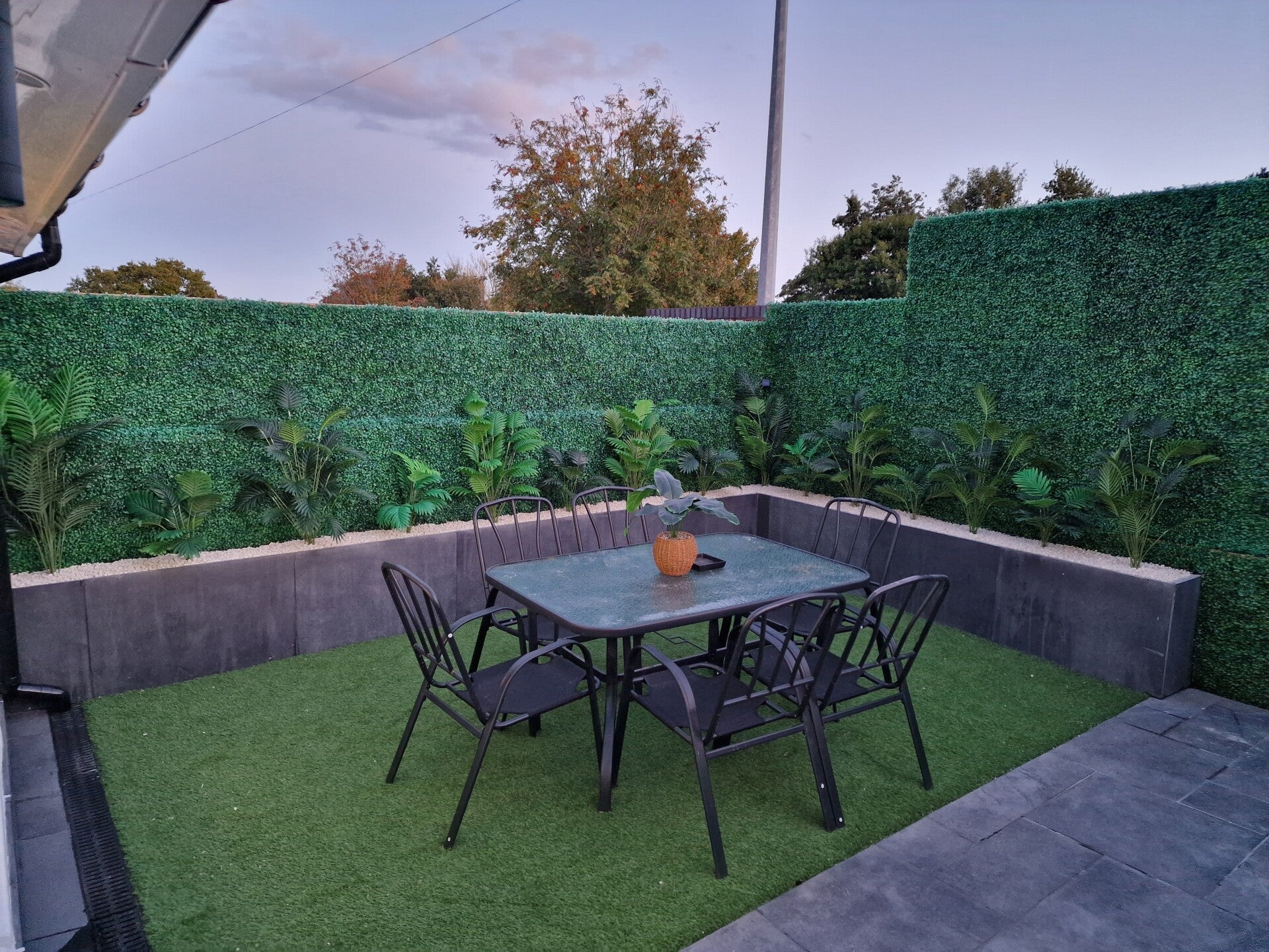 Below are some before and after photos we recently completed for a client: premium synthetic grass, a stunning Indian black slate patio, a gorgeous vertical garden with brick planter and natural stone cladding.